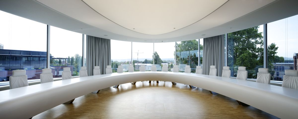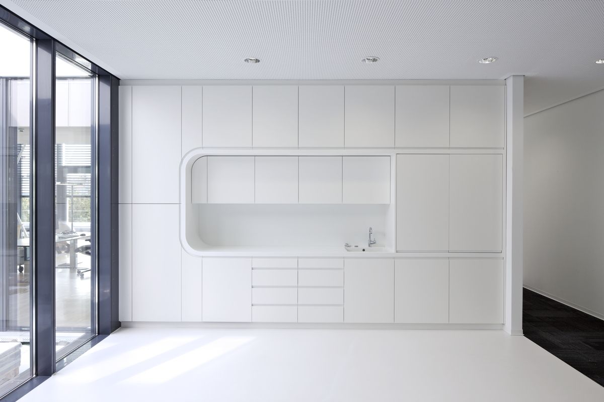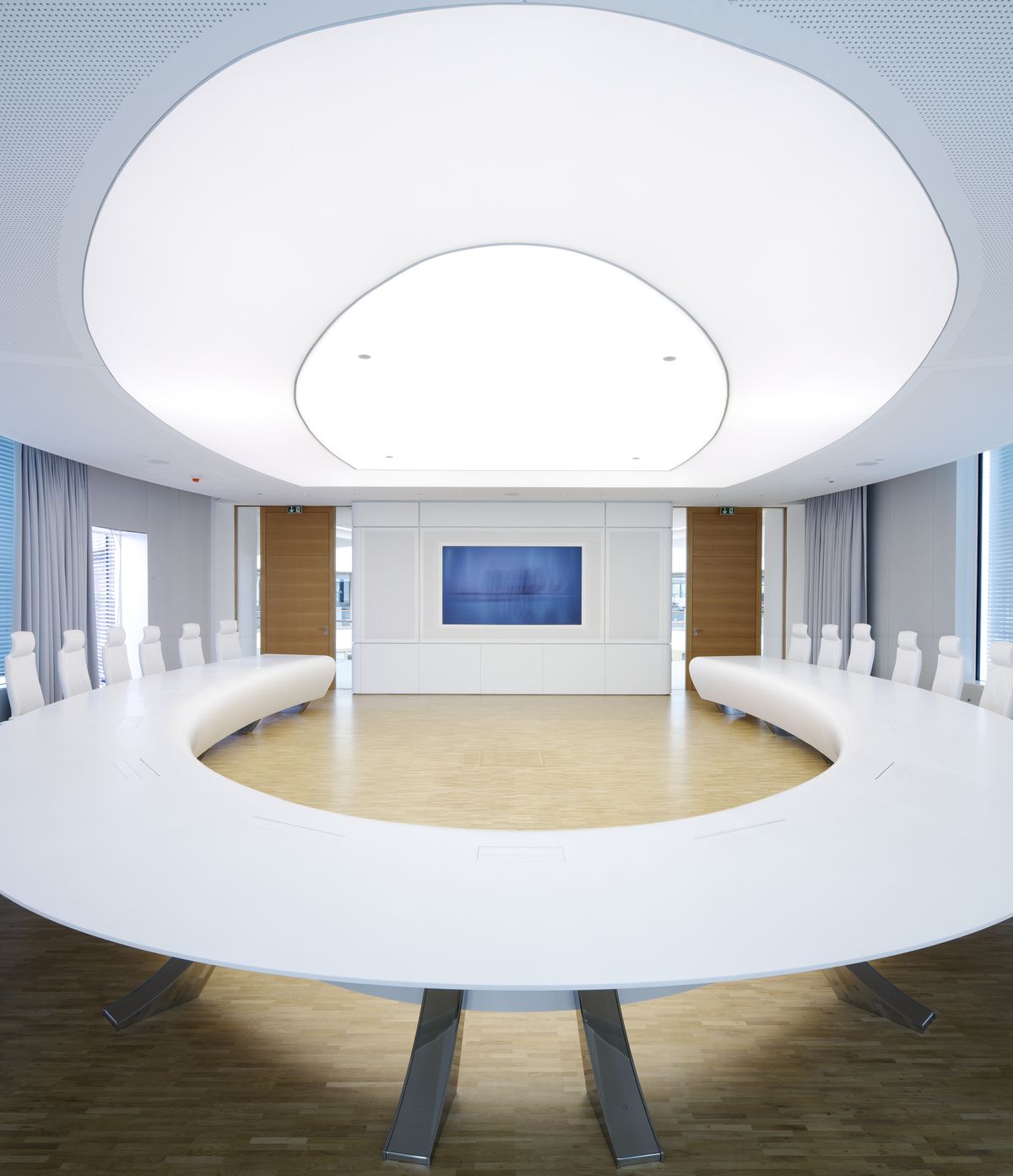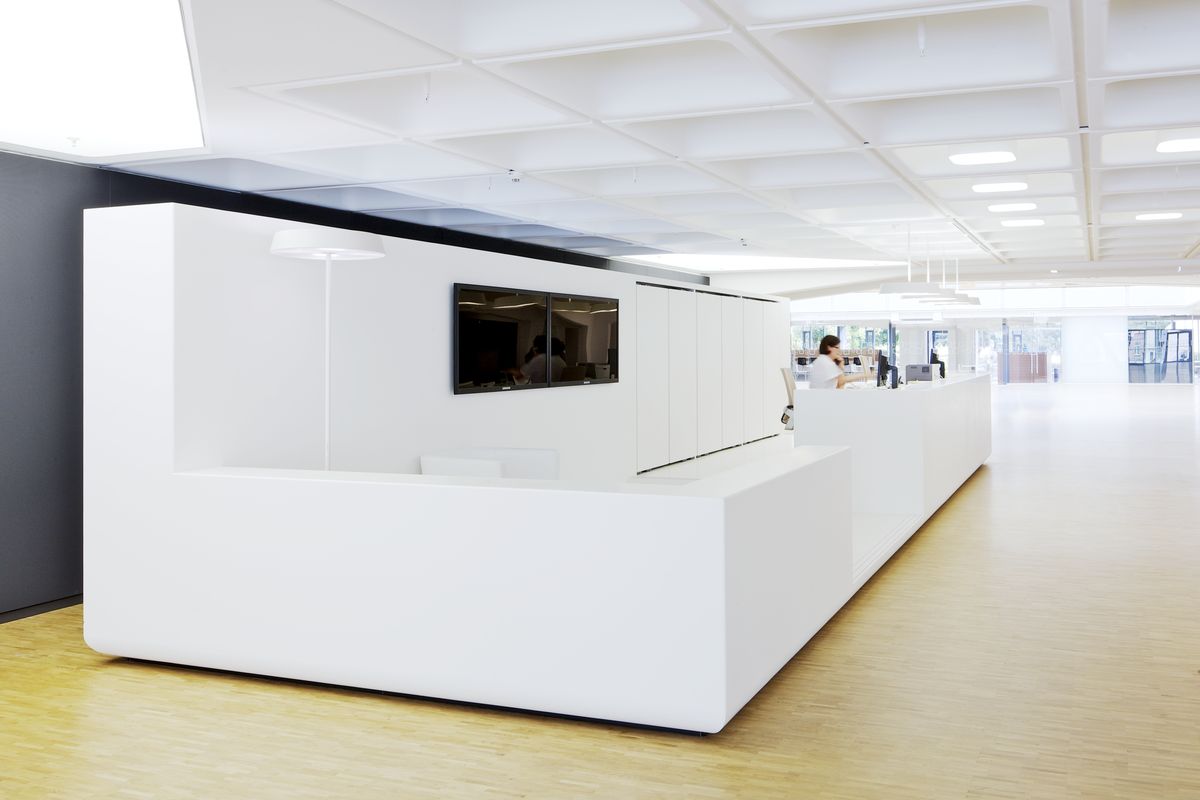 Konferenztisch für 24 Personen in Mineralwerkstoff mit ausfahrbaren Medienanschlüssen, Gestell aus verchromtem Stahl, Empfangstresen mit abgerundeten, thermisch verformten Ecken, Rückwand mit Garderobe und Schließfächern, Küchenzeile aus Mineralwerkstoff mit fugenlos integrierter Spüle mit Edelstahlboden. Insgesamt wurden 200 m² Mineralwerkstoff verbaut