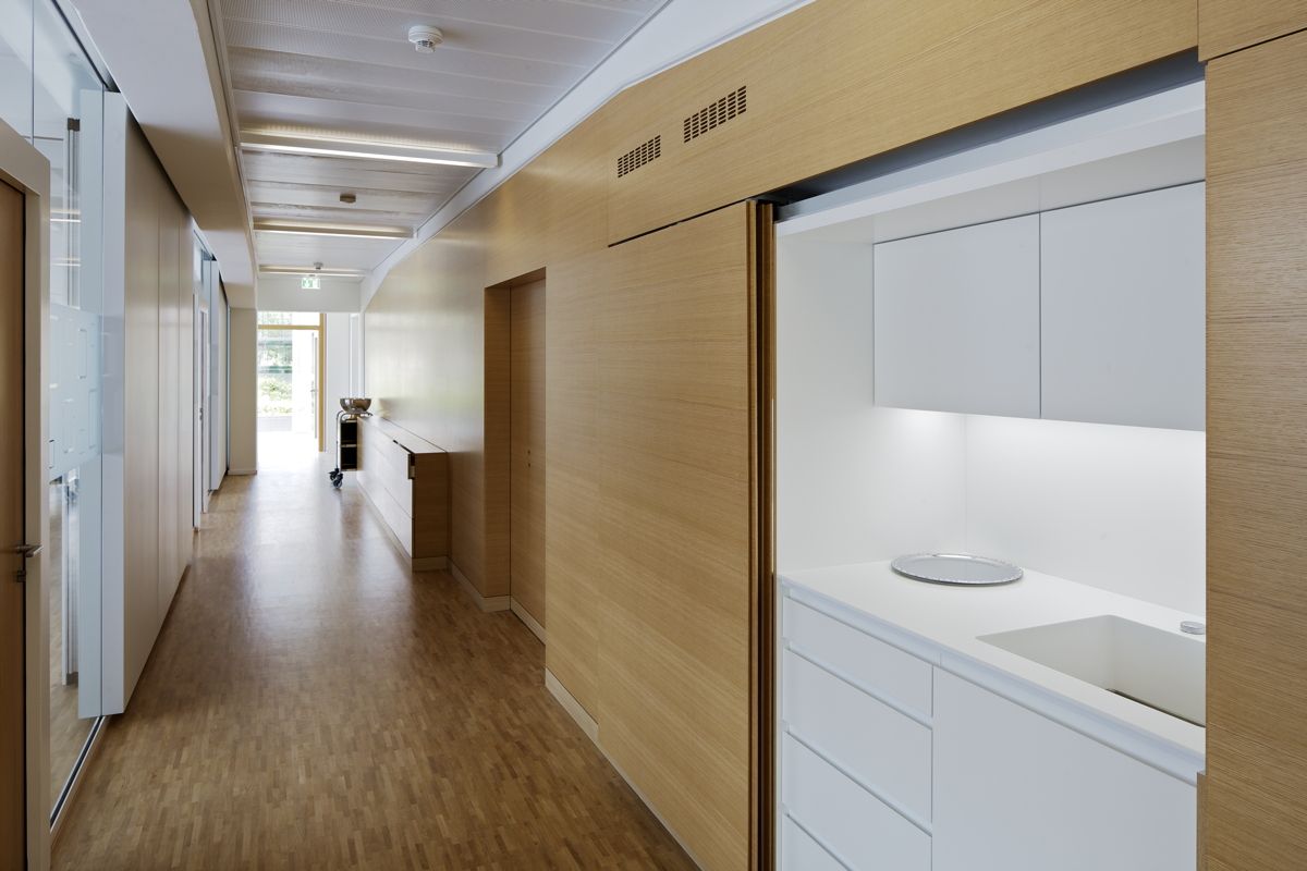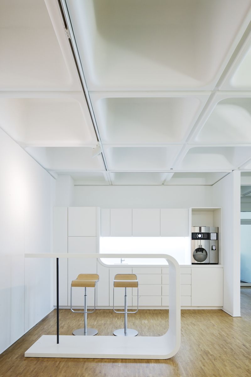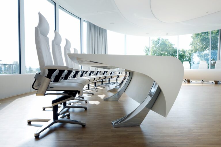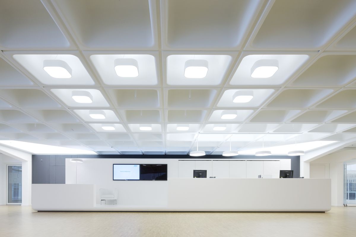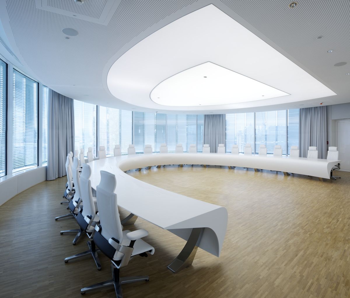 Konferenztisch für 24 Personen in Mineralwerkstoff mit ausfahrbaren Medienanschlüssen, Gestell aus verchromtem Stahl, Empfangstresen mit abgerundeten, thermisch verformten Ecken, Rückwand mit Garderobe und Schließfächern, Küchenzeile aus Mineralwerkstoff mit fugenlos integrierter Spüle mit Edelstahlboden. Insgesamt wurden 200 m² Mineralwerkstoff verbaut