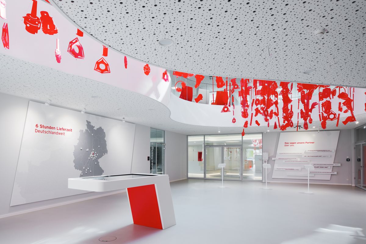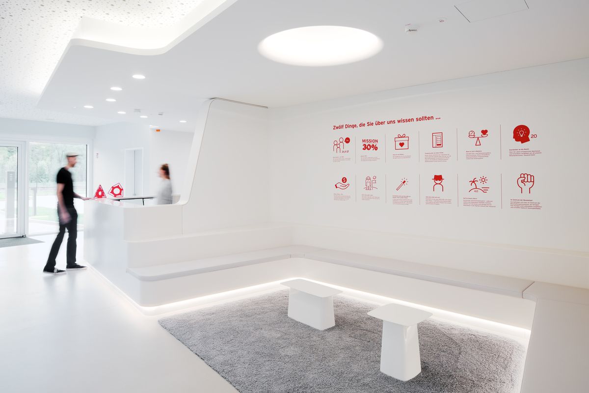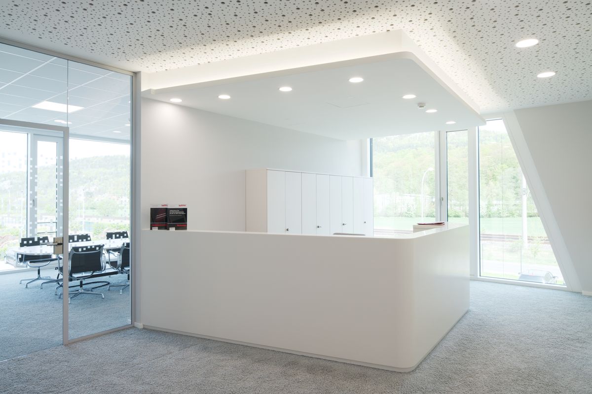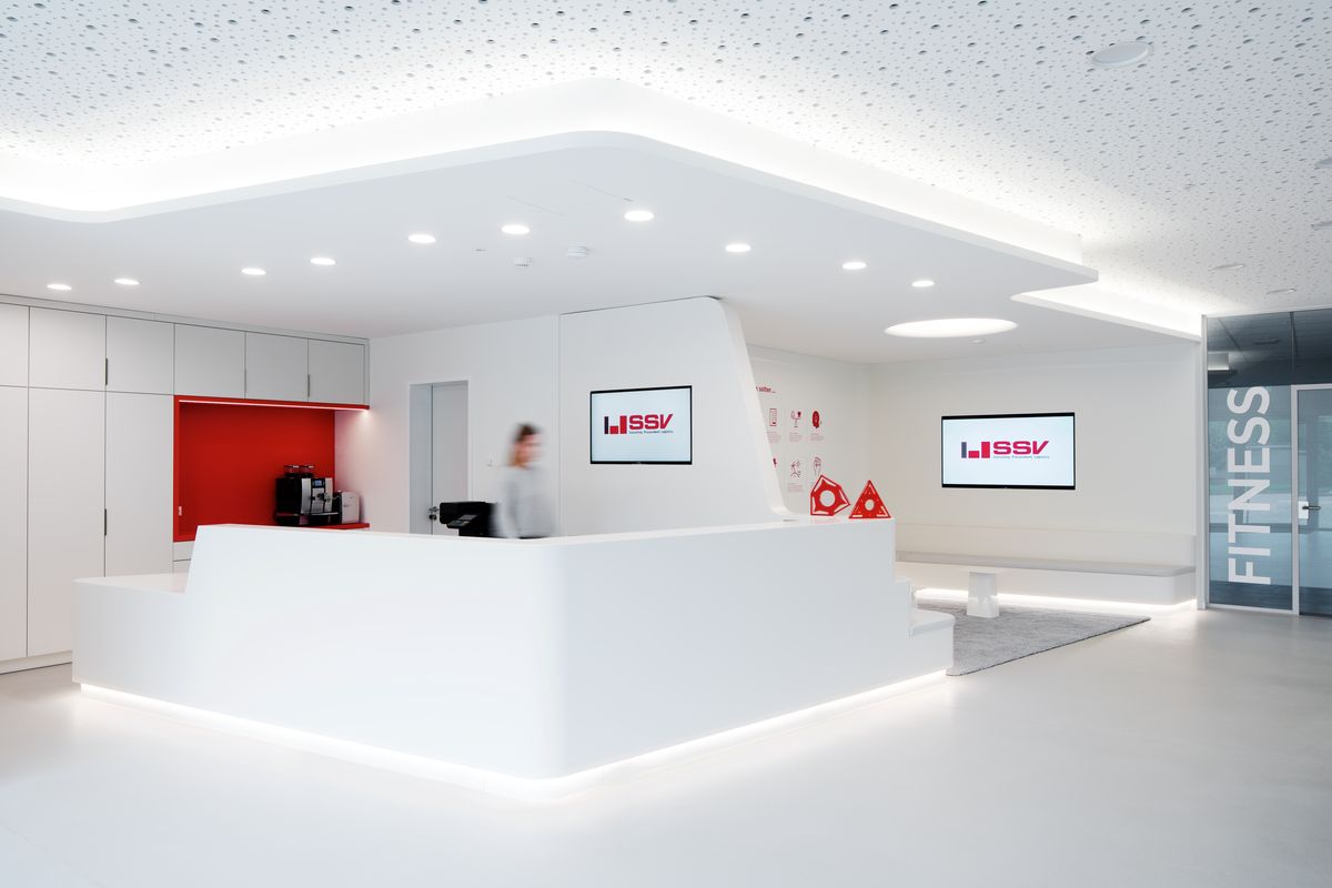 Empfangstresen- und Sitzbankanlage mit TV-Rückwand: Frontverkleidung, Arbeitsflächen Mineralwerkstoff weiß geschliffen, Ordner-Unterschränke mit Containersets und Organisationsschubladen; Verkleidung Wartebereich Mineralwerkstoff weiß geschliffen, Sitzfläche belegt mit Polstern SKAI Tundra; Frameless-Rahmen im rückseitigen Bereich mit wechselbaren Stoff, Komplett-Mineralwerkstoffverkleidung fugenlos verbunden, umlaufender Sockel indirekt LED-beleuchtet -