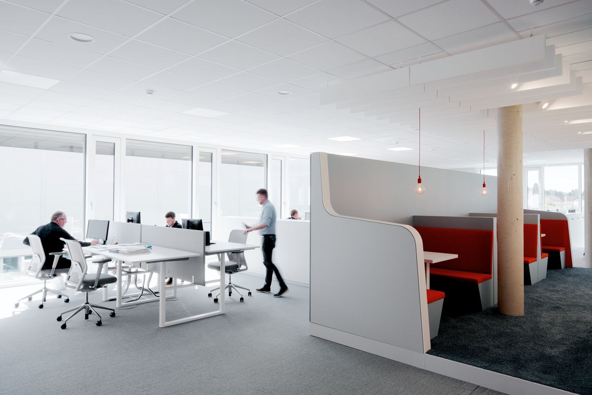 bestehend aus Bodenpodest mit Unterkonstruktion, belegt mit hochfloorigem Teppich, umlaufendem Sockel, U-Form-Wandfläche in Dekorplatte zweifarbig; Verkleidung: mit Stoff bespannte Weichfaserplatte – akustisch wirksam und als Pinnwandfläche nutzbar, oberer Abschluss Mineralwerkstoff weiß, aufgesetzte Schattenfuge, Oberfläche geschliffen, Trennwände auf Gehrung ausgeführt; Sitzbänke: Sitz- und Lehnfläche gepolstert -