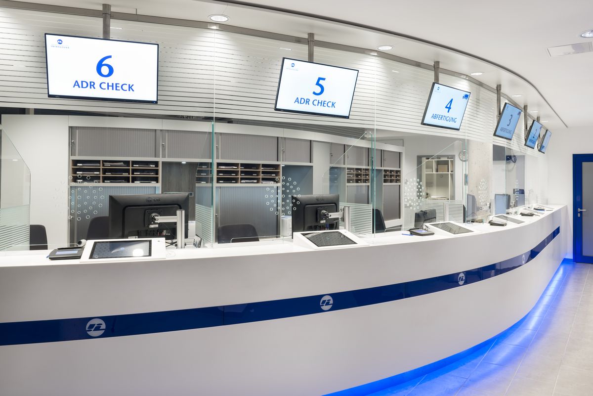 Front Schichtstoff, Aufsatz LG weiß, Taschenablage Arbeitsplatte MPX, Schichtstoff weiß; Glasaufsatz mit Antireflex und Sprechbohrungen, diversen Ausschnitten, Edelstahl-Sockel, LED-Lichtstreifen, Glastür mit Oberlicht, Rückschränken, Verkleidungen, Lamellenfronten, Sockel mit Lüftungsschlitzen, kompletten Einzelarbeitsplätzen sowie Tischsäulen-Monitoren und Magnetwand