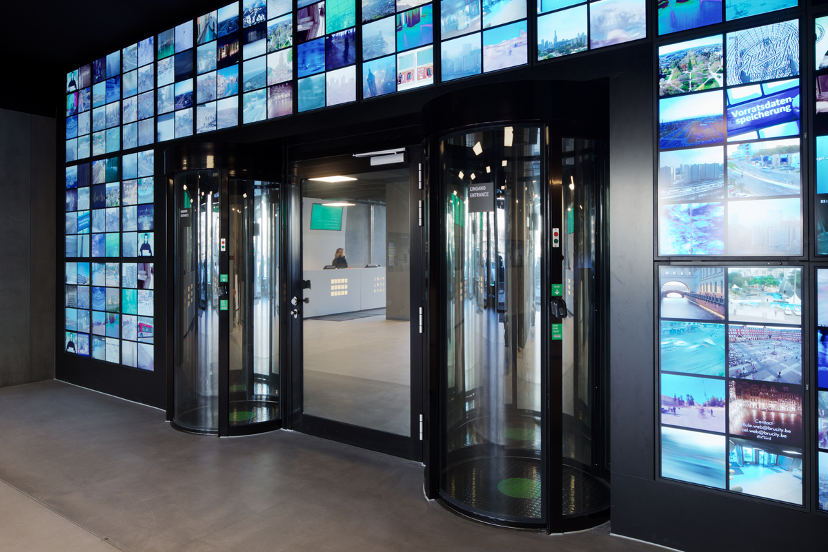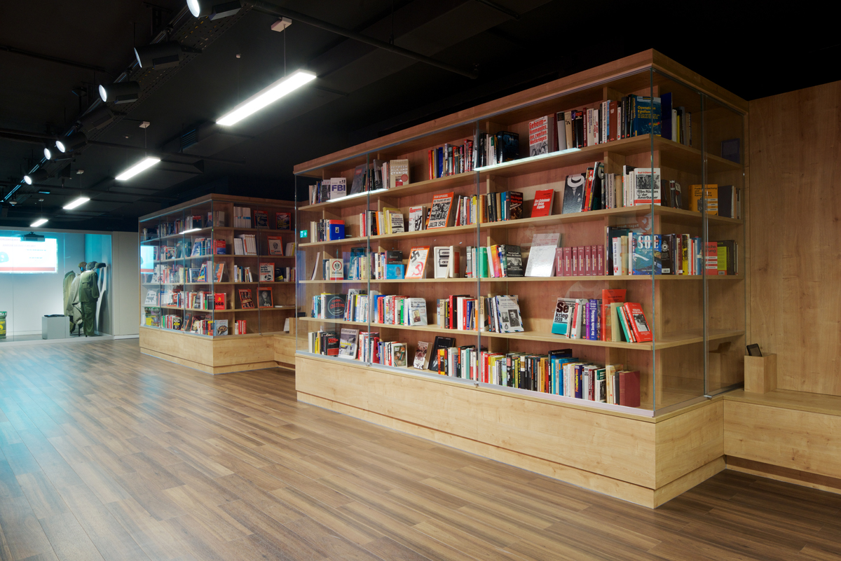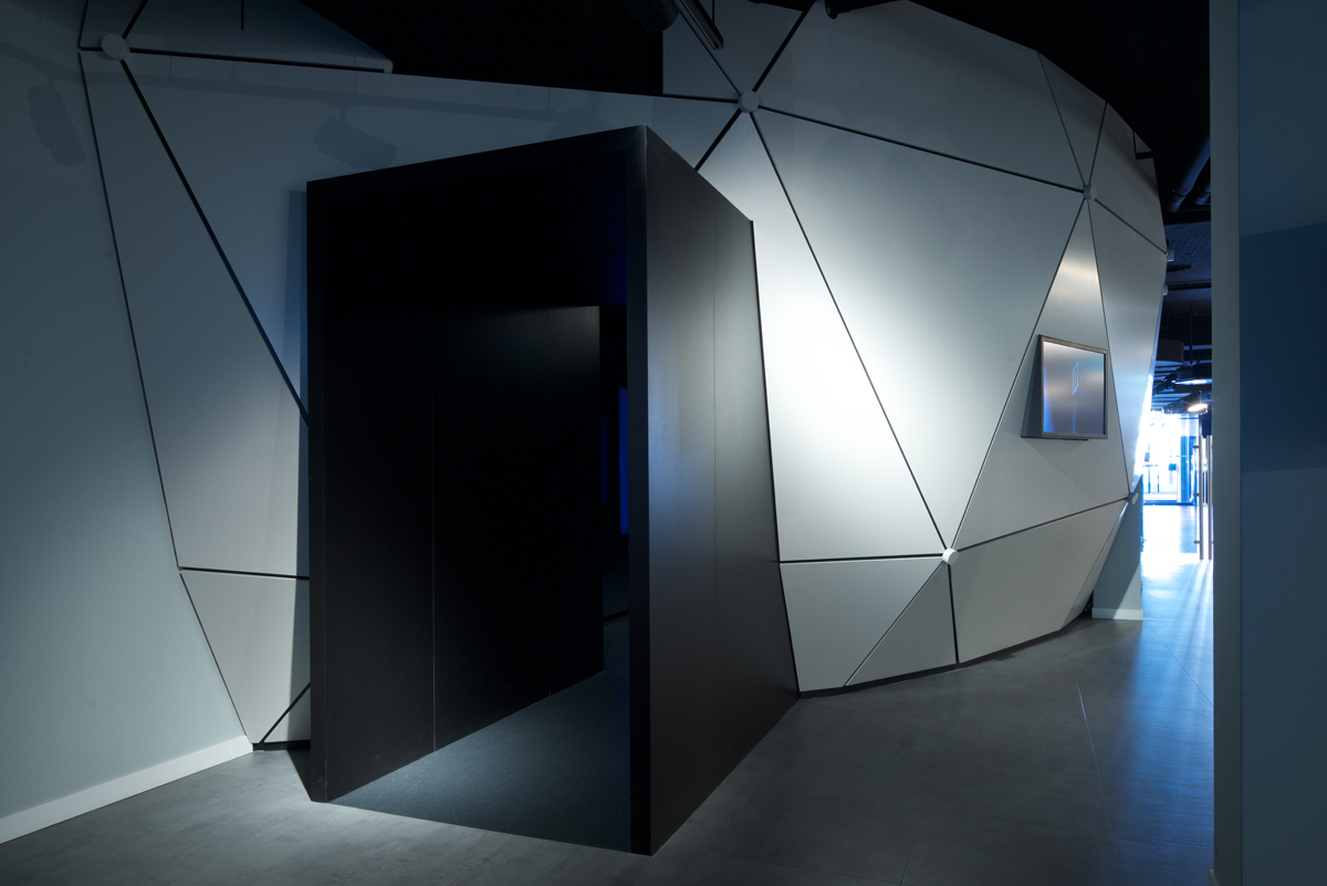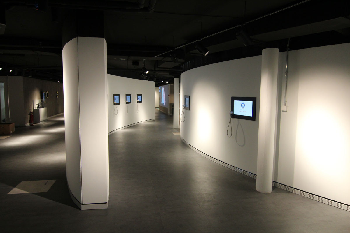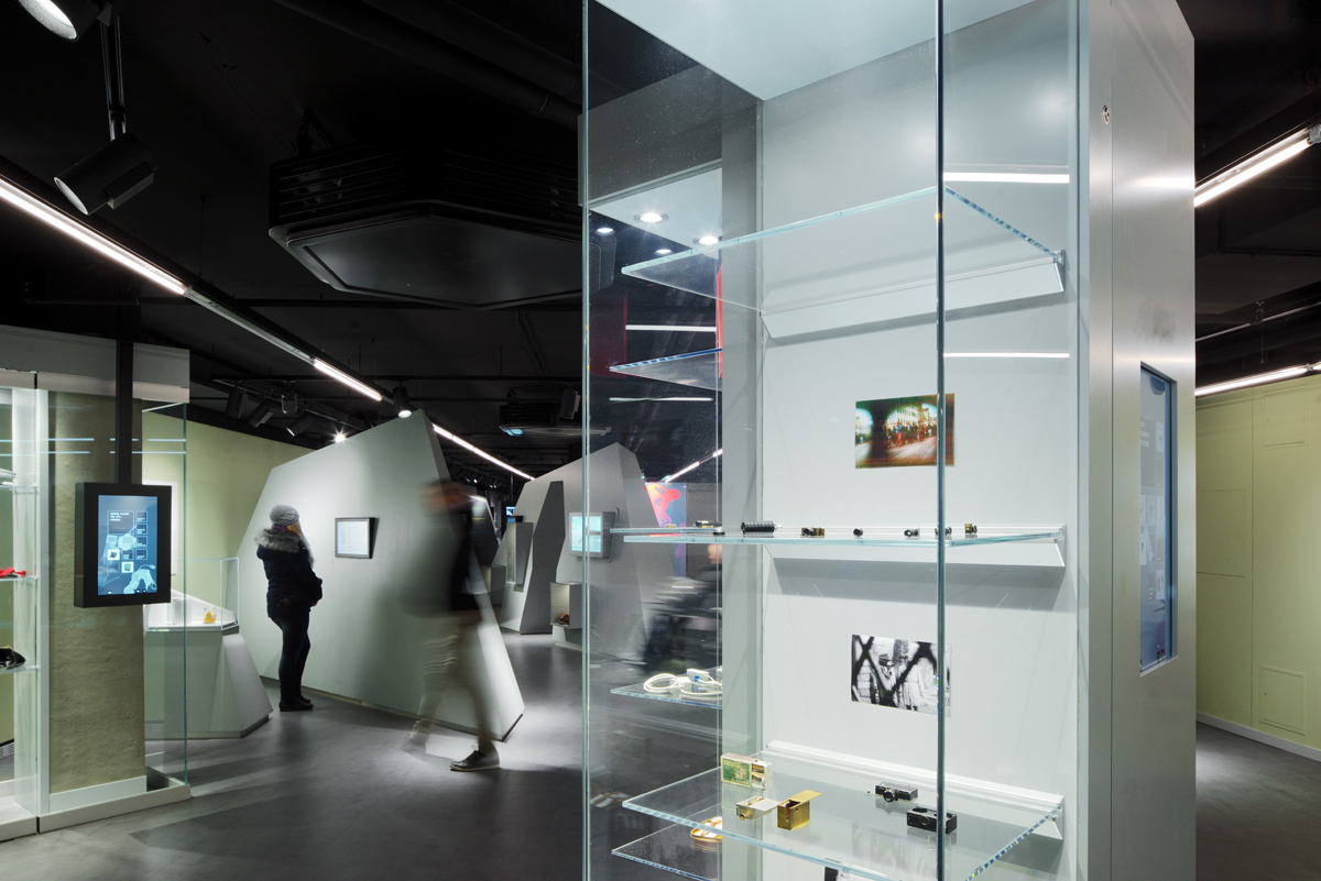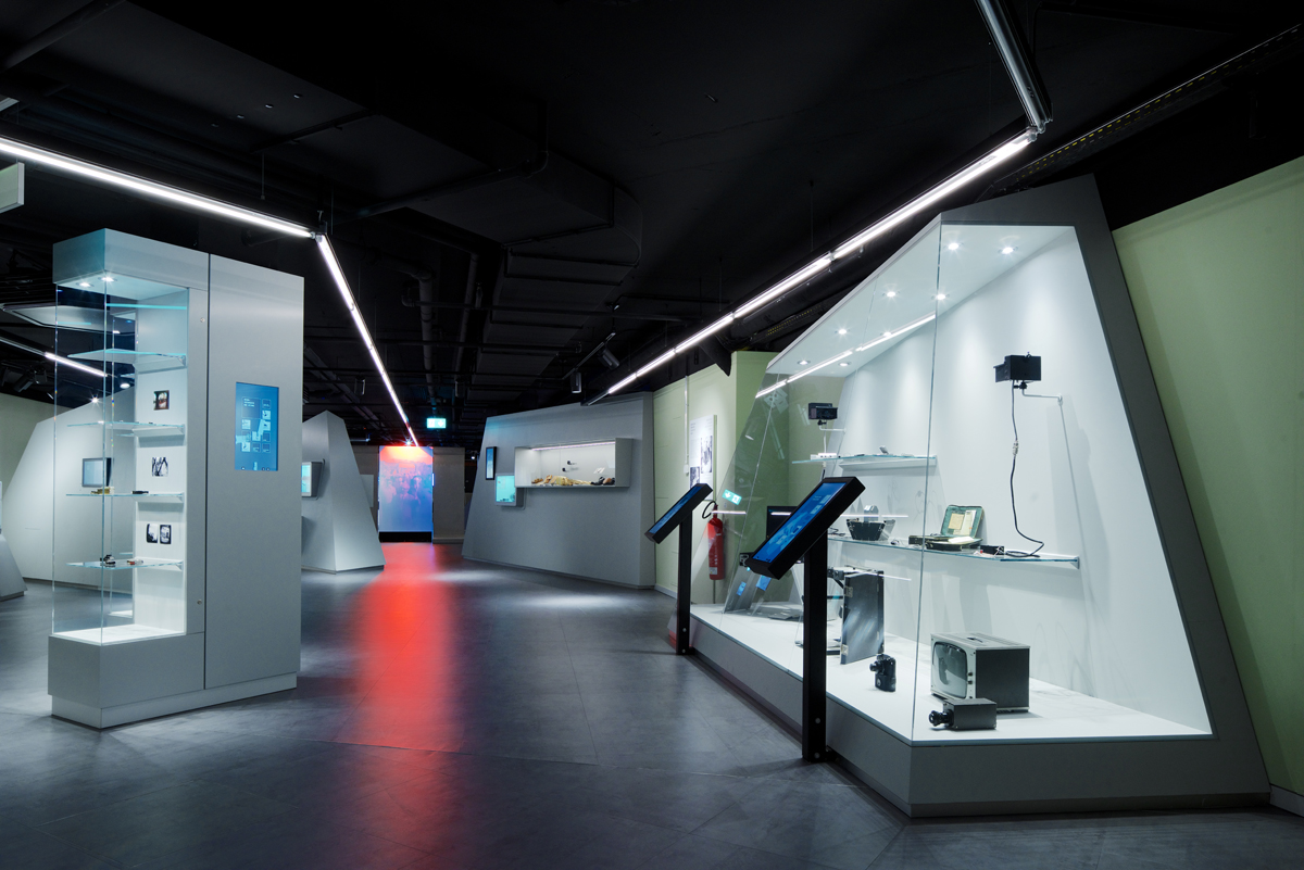 Möbel in Freiform mit integrierten Vitrinen und Monitoren