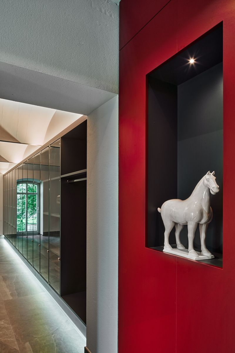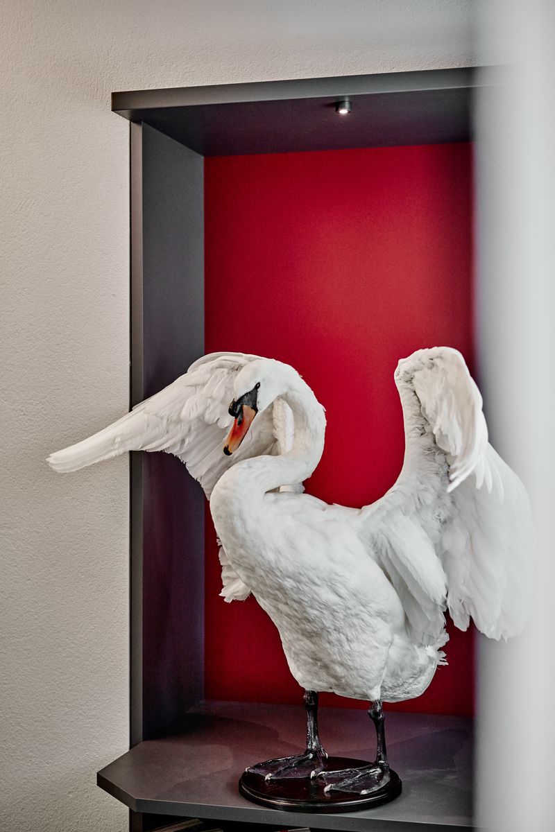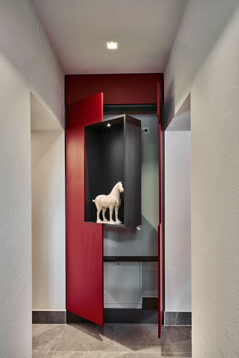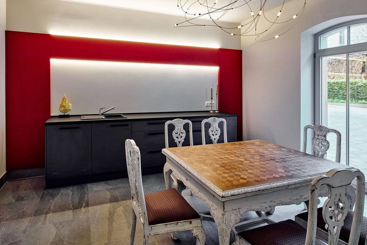 Korpus in Dekorplatte EGGER, Diamantgrau, Rückwand in Dekorplatte EGGER Burgundrot, Korpus mit Schattenfuge zur Nische -