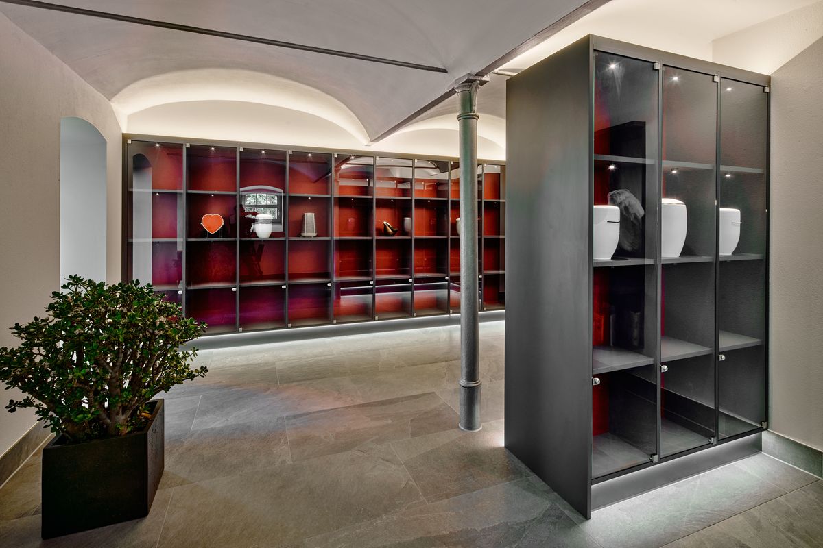 zerlegbar, transportabel, Korpus in Dekorplatte EGGER Diamantgrau mit 1 mm ABS - Kante, Rückwand in Dekorplatte EGGER Burgundrot, einschlagende Glastüren mit Glastürschloß, Sockelbeleuchtung, Kranz - u. Deckenbeleuchtung -