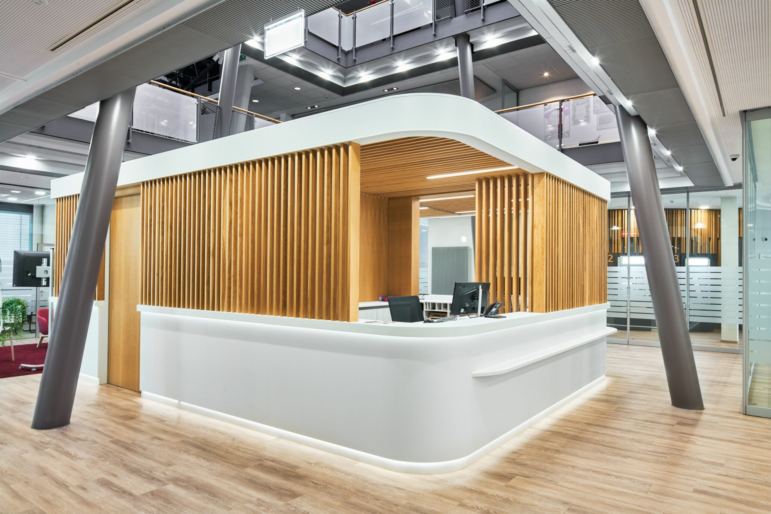 Eigenherstellung 5930 x 6670 x 2920 mm, Verkleidung oben und unten gebogen Holzwerkstoff, belegt mit HPL, Schränke und Wandbau inkl. Schiebetüren, LED - Bänder umlaufend, höhenverstellbare Tische, Eiche - Lamellen 26 mm, Oberfläche geölt HWS