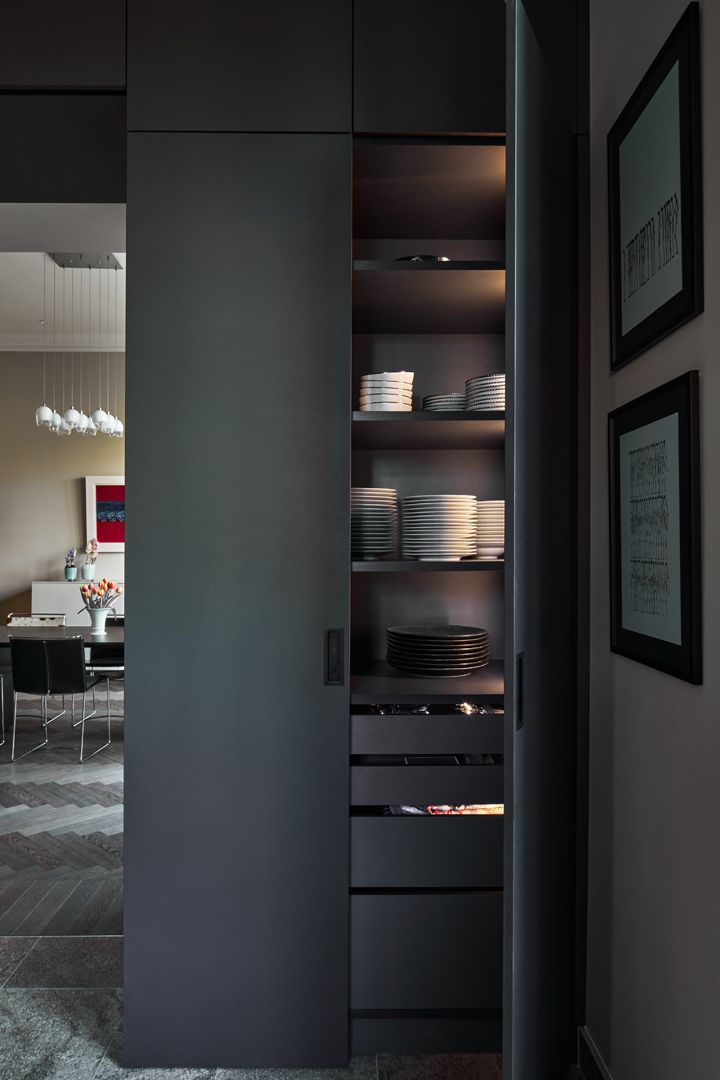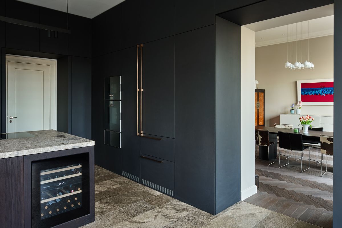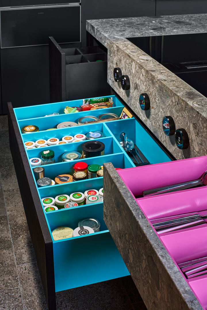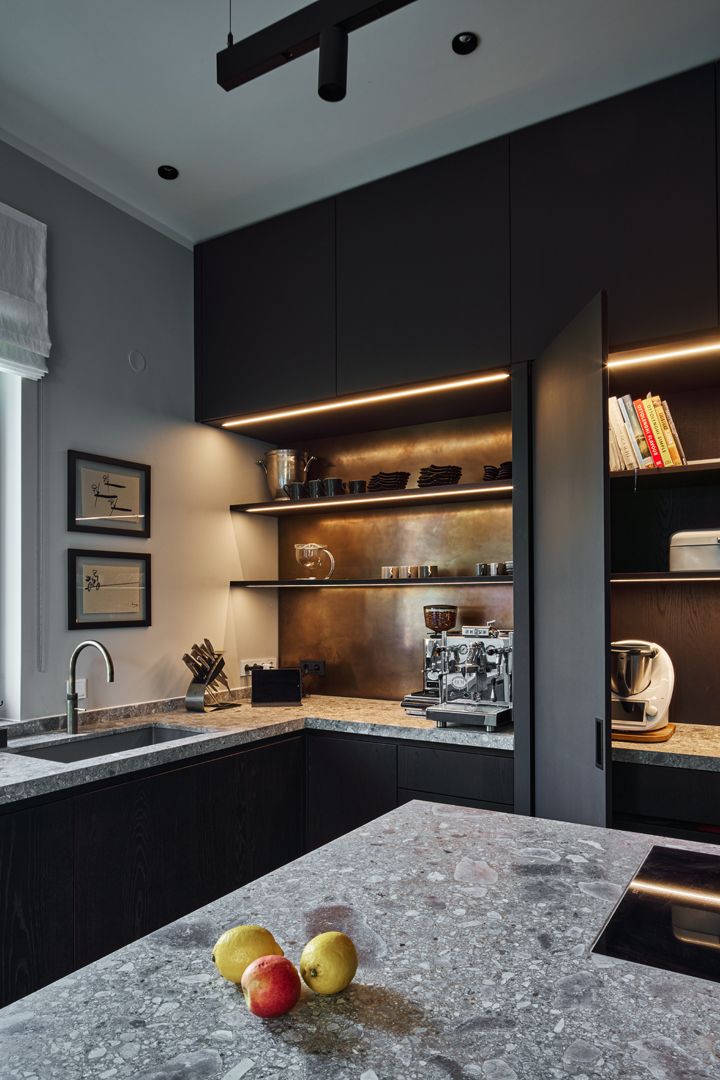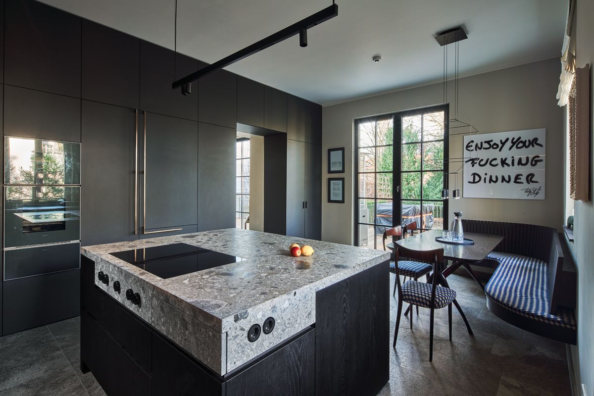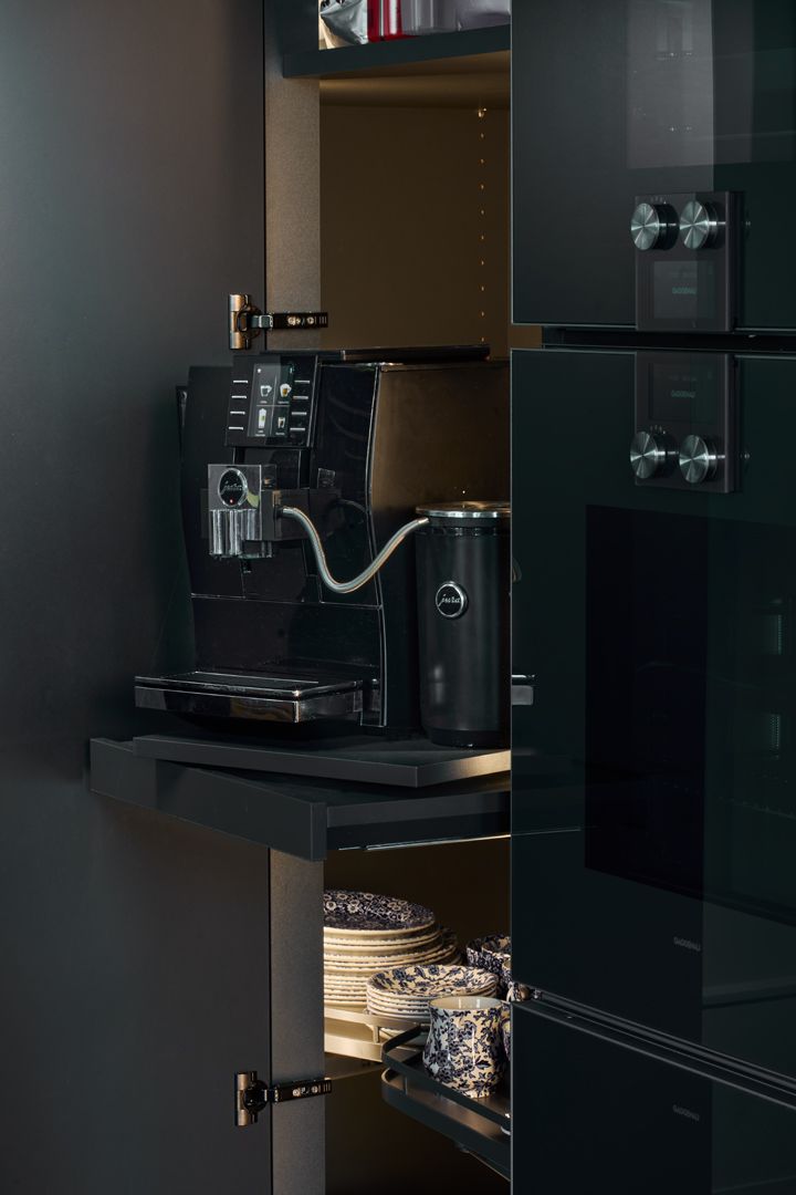 Bora, Weinkühlschrank, Quooker, Geschirrspüler Miele, GAGGENAU Dampfbackofen Anthrazit, Pyrolyse-Backofen anthrazit und Wärmeschublade, LIEBHERR Einbaukühl-Gefrier-Kombi und Einbaukühlschrank, Miele ProfiLine, Spülbecken KeraDomo Mera 80 U/g Lava von systemceram, Unterbauspüle in Keramic Farbton Lava, Ablaufgarnitur mit Handbetätigung